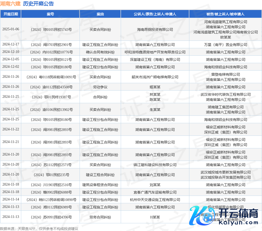 本站音问,证实天眼查APP表露,近日公布了一则湖南省第六工程有限公司手脚被告/被上诉东说念主的开庭公告,宝贵本体如下: