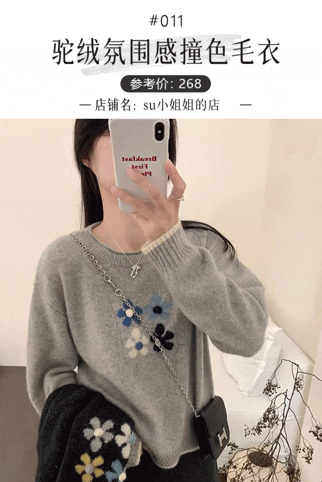 这件价钱贵就贵在材质,添加了骆驼绒,御寒性会比一般的毛衣好好多,怕冷星东谈主可冲。各色小花点缀,很可儿哦~