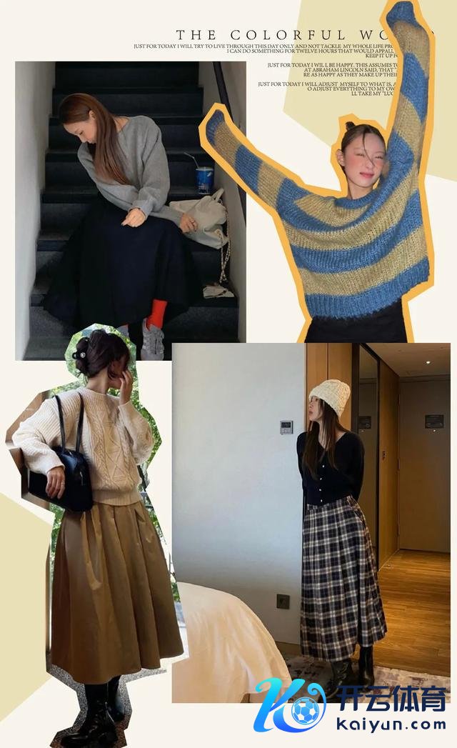 这种比拟韩系的神气就很合适底下搭配个同色系半裙,外面不论穿什么外衣王人能齐全match。