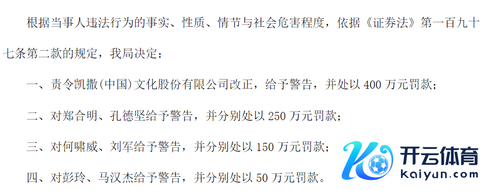凭证前述犯法事实,广东证监局最终决定责令ST凯文改正,给予申饬,并处以400万元罚金,对ST凯文时任董事长郑合明等6位相关拖累东谈主分辨处以50万元至250万元不等的罚金。