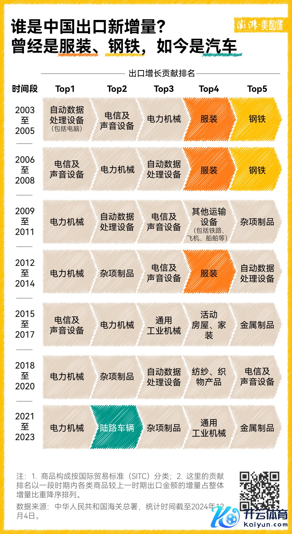 滂沱新闻通过梳理往日 20 多年什么产物拉动了全体出口增速,也发现了中国生意结构的优化。在 21 世纪的头 10 年,服装和钢铁显耀拉动了国内的出口生意,而在近几年,汽车则成为出口新引擎之一。