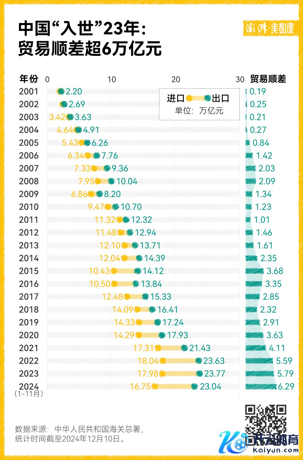 这种势头在本年预计也将连续保持。凭据海关总署 12 月 10 日发布的统计快讯,2024 年前 11 个月,国内累计出口和进口总和均向向前年同时水平,生意顺差也曾向上了 2023 年全年的水平,达 6.29 万亿元。
