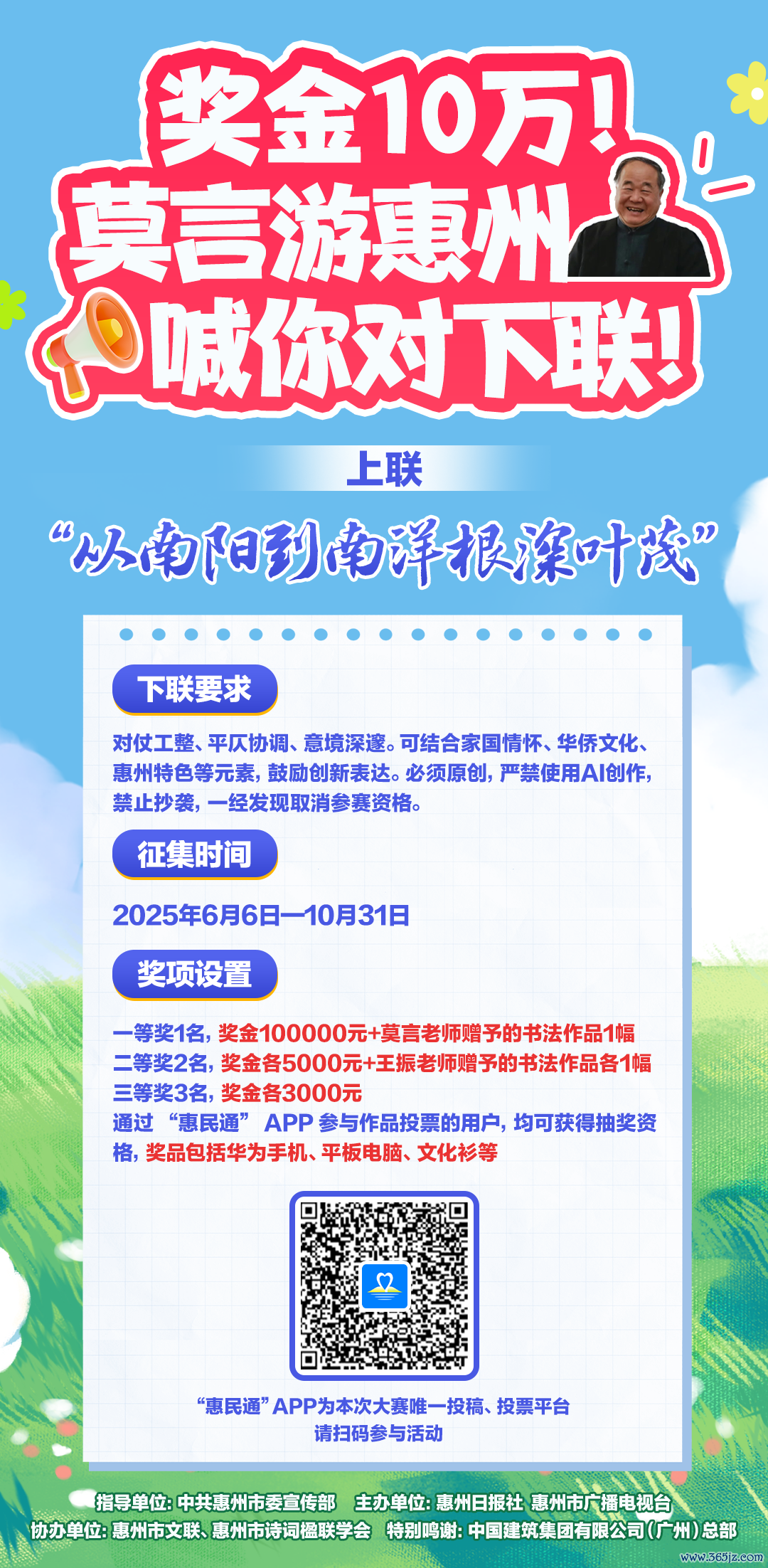 据悉,本次“对下联”看成将由惠州市诗词楹联学会大众评审团筛选出50件优秀作品干与终评,主持方邀请莫言敦厚担任大众评审团团长,王振担任大众评审团书记长。