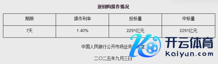 中新网9月3日电据央行网站音书,2025年9月3日中国东谈主民银行以固定利率、数目招标形势开展了2291亿元逆回购操作。具体情况如下: